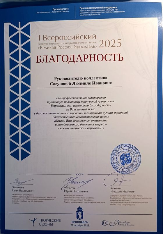 Конкурс проходил 28 октября в г. Ярославль, участники приехали с разных городов России: г. Москвы, Московской области, г. Санкт-Петербурга, г. Сочи, г. Брянска, Нижегородской области, г. Ярославль, г. Углич. Оценивало конкурс профессиональное жюри: солисты ансамбля "Берёзка", ансамбля народного танца имени Игоря Моисеева, ансамбля песни и пляски Краснознаменного флота. По итогам конкурса коллектив "Наш стиль" стал лауреатам ll степени в 4 номинациях. Мы поздравляем коллектив и руководителя Людмилу Ивановну Сосунову!