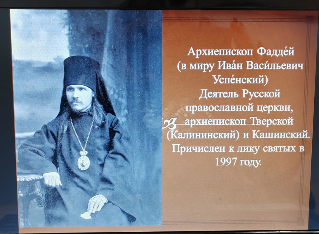 Педагог-организатор Екатерина Иваненко рассказала ребятам о жизни архиепископа Фаддея. 26 октября 1993 года были обретены его честные мощи, которые находятся ныне в Вознесенском соборе города Твери. В 1997 году был причислен к лику святых. После ребятам было предложено ответить на вопросы викторины о ключевых моментах жизни священномучиника Фаддея. Ребята с интересом отвечали на вопросы викторины и успешно справились со всеми заданиями.